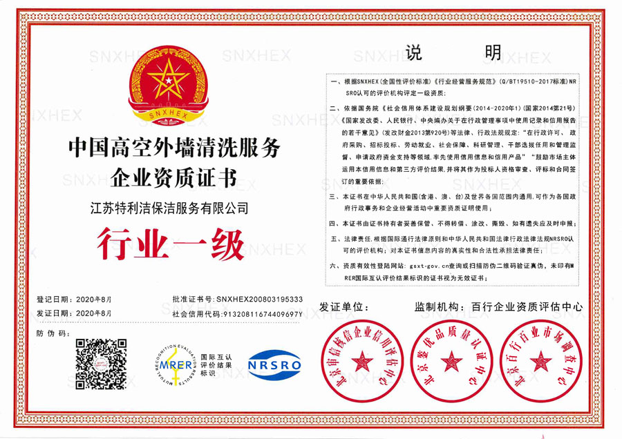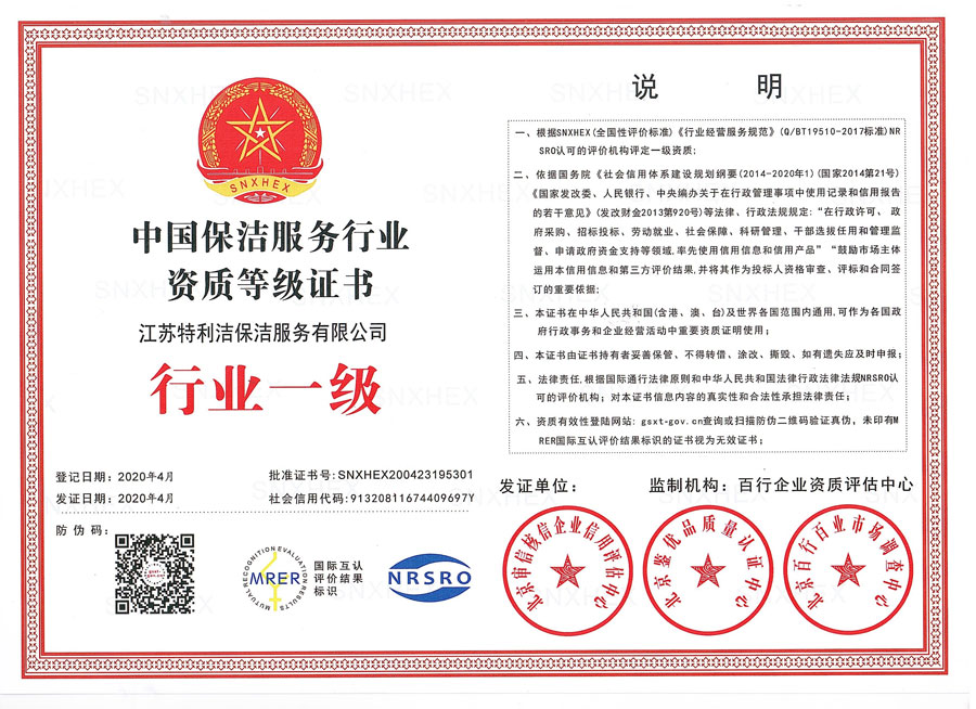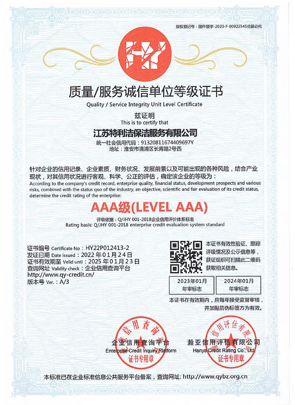 江蘇特利潔保潔服務(wù)有限公司(前稱為淮安市特利潔保潔服務(wù)有限公司),成立于2003年,于2018年經(jīng)工商變更登記為“江蘇特利潔保潔服務(wù)有限公司”,是經(jīng)工商部門登記注冊的合法企業(yè)。公司員工經(jīng)系統(tǒng)培訓(xùn)后上崗,本公司全部采用特利潔專業(yè)清洗設(shè)備、藥劑,并秉承了特利潔先進(jìn)的管理模式,具備了專業(yè)的清洗技術(shù)、服務(wù)和網(wǎng)絡(luò)優(yōu)勢以及一批訓(xùn)練有素的專業(yè)清潔隊(duì)伍及管理人員,致力于推動淮安清洗行業(yè)朝著規(guī)范化、專業(yè)化、標(biāo)準(zhǔn)化方向發(fā)展。公司成立至今,經(jīng)過我們?nèi)w員工的不懈努力,以及本著“誠信、專業(yè)、周到”的服務(wù)使得接受過我們服務(wù)的每一位客戶均能成為我們的長期合作對象。公司也從起初十幾名員工的小公司逐漸發(fā)展壯大,現(xiàn)已初具規(guī)模,并在保潔行業(yè)當(dāng)中占據(jù)一定份額,F(xiàn)與恒大集團(tuán)等世界500強(qiáng)企業(yè)建立戰(zhàn)略合作。2018年10月公司取得三A信用評級、三A重合同守信用單位...